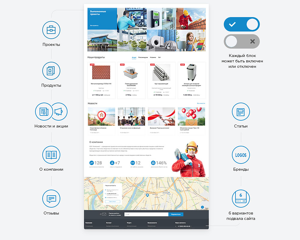 4 варианта главной страницы включают все необходимое для презентации компании – основные баннеры, блоки тизеров, услуг, портфолио, каталога, новостей и акций. Дополнительно вы можете вывести отзывы, бренды, блок о компании и бренды.